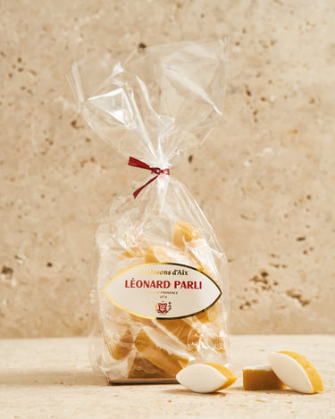 Découvrez notre sachet de Mini Calissons, véritables petits trésors de la Maison Léonard PARLI. Fidèles au savoir-faire traditionnel depuis 1874, ces mini Calissons sont élaborés avec une pâte onctueuse composée de 42 % d’amandes, de melon confit à cœur et d’écorces d’oranges confites, lentement broyés sous d’anciens rouleaux de granit. Cette forte teneur en amandes leur confère un goût intense et authentique, signature unique de notre maison.