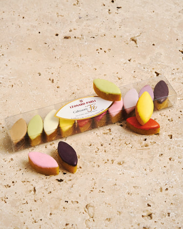 Petit frère du Calisson d'Aix-en-Provence traditionnel, dans notre réglette multicolore, le Mini Calisson de la Maison PARLI s'associe avec nos "Fé" fruités, fleuris et épicés confectionnés à partir des mêmes ingrédients que notre Calisson d'Aix - amandes entières, melon confit et écorce d’orange confite - auxquels sont ajoutés nos fruits confits et d’autres extraits naturels.